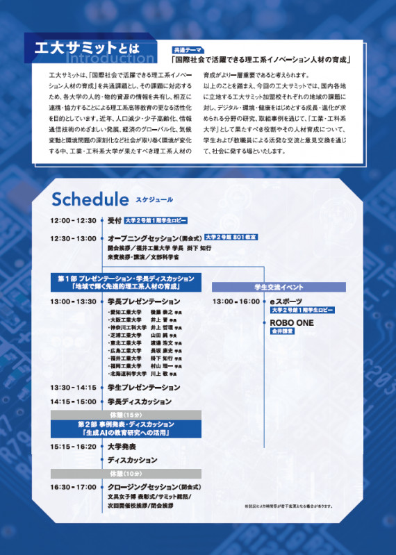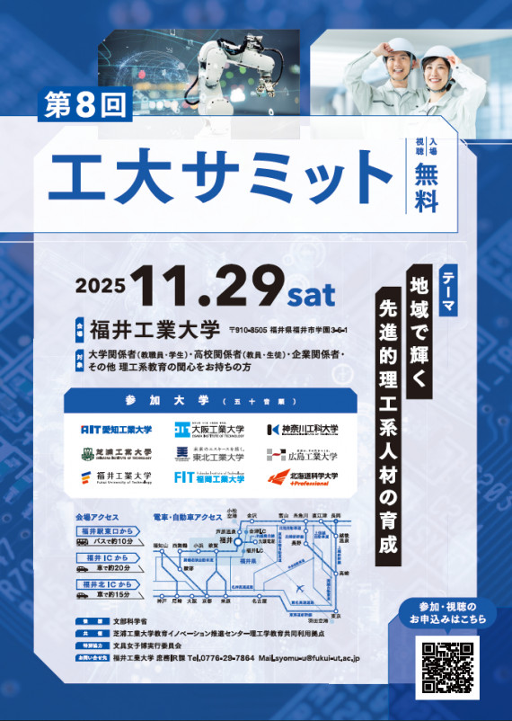 While last year’s summit was hosted by Kanagawa Institute of Technology, this year’s event will take place at Fukui University of Technology. The summit will serve as a platform for students, faculty, and staff to actively exchange ideas and engage in discussions on the roles and responsibilities of science and technology universities. Through research presentations and case studies addressing regional challenges—particularly in the fields of digital technology, environmental sustainability, and health—the summit will explore how these institutions can contribute to society and foster the next generation of innovators.